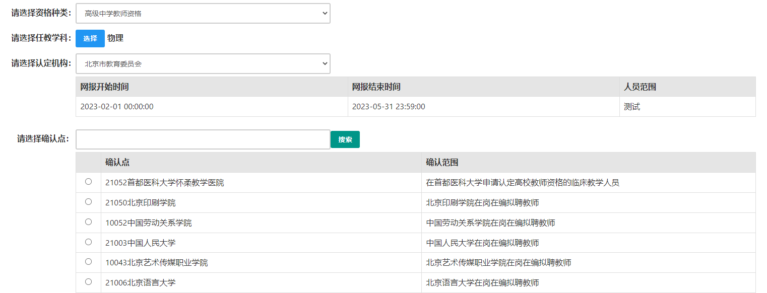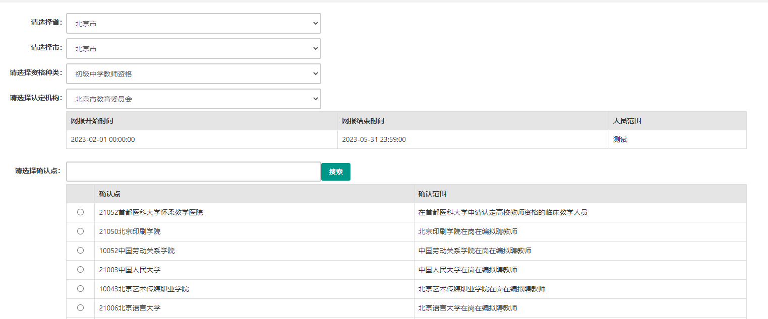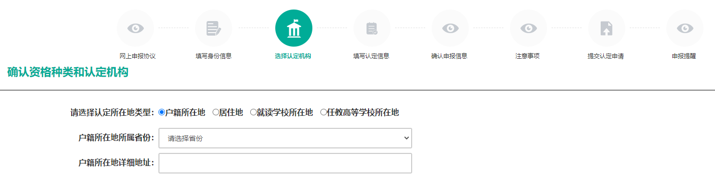 選擇認(rèn)定所在地省、市、資格種類、任教學(xué)科后,可選擇有對(duì)應(yīng)資格認(rèn)定權(quán)限的認(rèn)定機(jī)構(gòu),選擇符合確認(rèn)范圍的確認(rèn)點(diǎn)后,點(diǎn)擊【下一步】進(jìn)入步驟四。