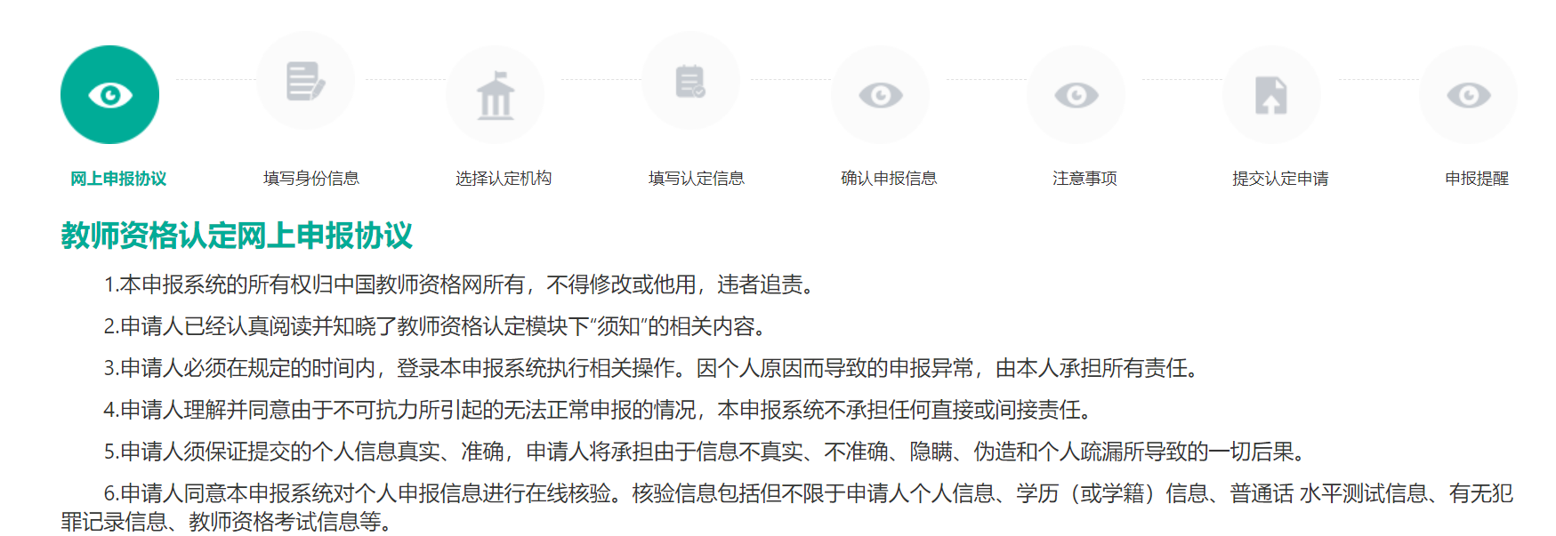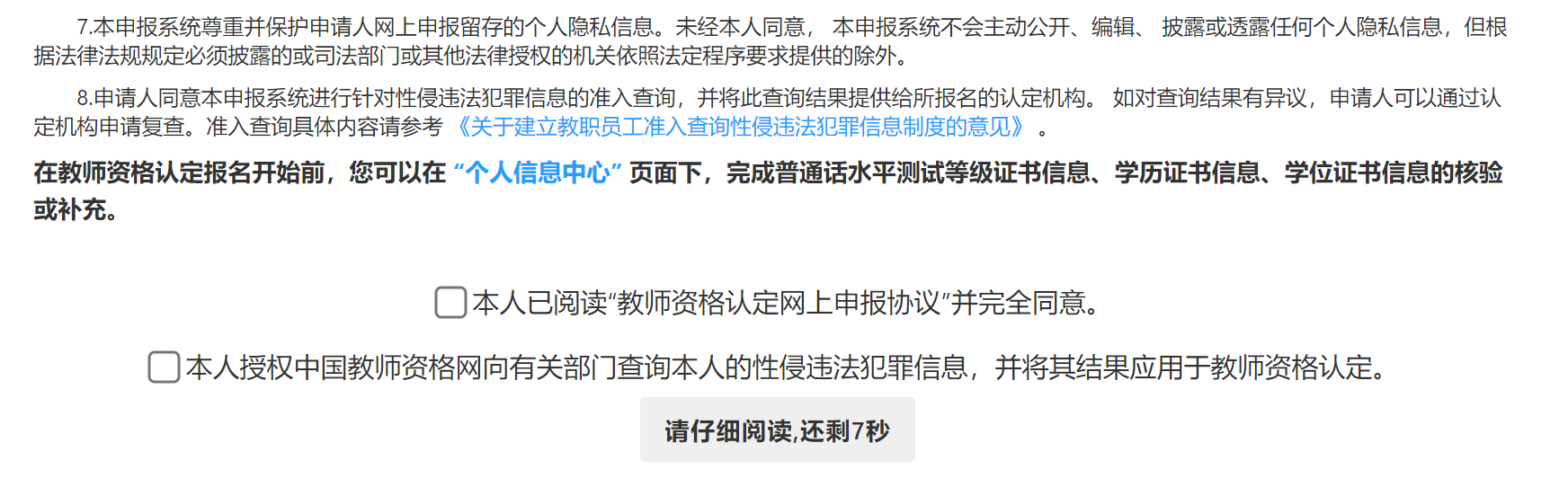 請(qǐng)仔細(xì)閱讀教師資格認(rèn)定網(wǎng)上申報(bào)協(xié)議,同意協(xié)議內(nèi)容及授權(quán)后,勾選下方“本人已閱讀“教師資格認(rèn)定網(wǎng)上申報(bào)協(xié)議”并完全同意”及“本人授權(quán)中國教師資格網(wǎng)向有關(guān)部門查詢本人的性侵違法犯罪信息,并將其結(jié)果應(yīng)用于教師資格認(rèn)定”的復(fù)選框,點(diǎn)擊【下一步】進(jìn)入步驟二。