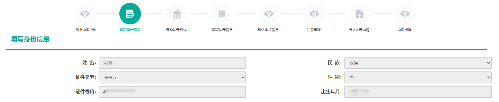 包括姓名、民族、證件類型、性別、證件號(hào)碼、出生年月,此部分信息為讀取【個(gè)人信息中心】欄目下的個(gè)人身份信息,無需錄入。