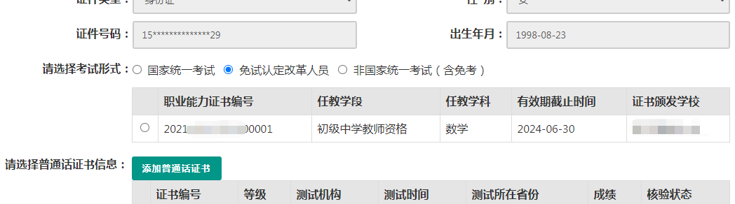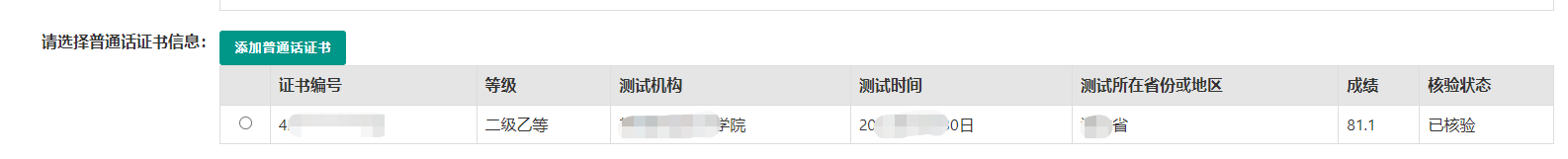 選擇參與本次認(rèn)定的本人名下的普通話證書信息。如您沒有在個(gè)人信息中心添加信息,請(qǐng)點(diǎn)擊“添加普通話證書”按鈕進(jìn)行添加,操作方式同【個(gè)人信息中心】普通話證書信息。申請(qǐng)認(rèn)定幼兒園教師資格的申請(qǐng)人,只能選擇二級(jí)乙等及以上的普通話證書。
