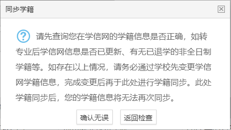 注意:轉(zhuǎn)專業(yè)后學(xué)信網(wǎng)信息未更新、存在已退學(xué)的非全日制學(xué)籍等,如存在以上情況,請(qǐng)務(wù)必通過學(xué)校先變更學(xué)信網(wǎng)學(xué)籍信息,完成變更后再于此處進(jìn)行學(xué)籍同步。