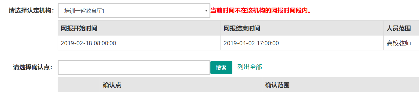 選擇相應(yīng)確認(rèn)范圍的確認(rèn)點(diǎn),點(diǎn)擊【認(rèn)定申請(qǐng)報(bào)名】按鈕進(jìn)入認(rèn)定報(bào)名環(huán)節(jié)。