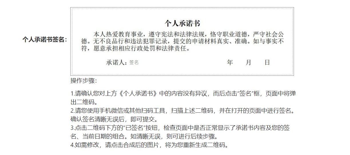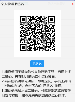 點(diǎn)擊個(gè)人承諾書圖片,按照“操作步驟”的說明完成簽名。如需修改,再次點(diǎn)擊個(gè)人承諾書圖片,即可重新獲取二維碼并簽名。