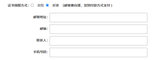 只有選擇支持郵寄的認(rèn)定機(jī)構(gòu),才能選擇郵寄方式,并詳細(xì)填寫收件人相關(guān)信息。證書領(lǐng)取方式請(qǐng)查看認(rèn)定機(jī)構(gòu)相關(guān)的工作要求說明。