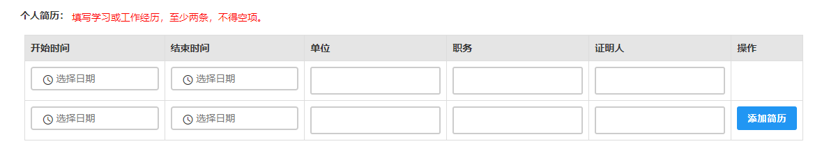 需要填寫學(xué)習(xí)或工作經(jīng)歷,至少兩條,不得空項(xiàng)。點(diǎn)擊【添加簡歷】按鈕即可增加一行,填寫完成后點(diǎn)擊【下一步】進(jìn)入步驟五。