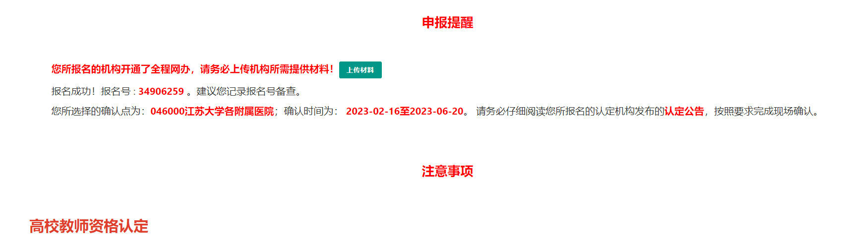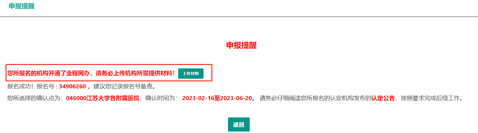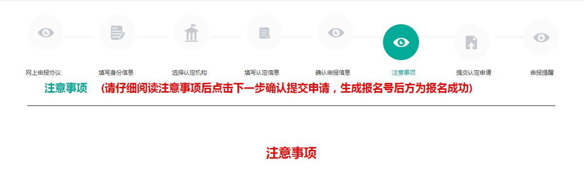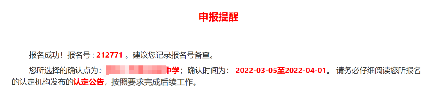 頁面展示申報(bào)提醒即為報(bào)名成功,請(qǐng)仔細(xì)閱讀頁面中的內(nèi)容并做好相關(guān)信息記錄,并按照要求完成后續(xù)工作,于確認(rèn)時(shí)間范圍內(nèi),按照認(rèn)定機(jī)構(gòu)的要求完成后續(xù)工作。