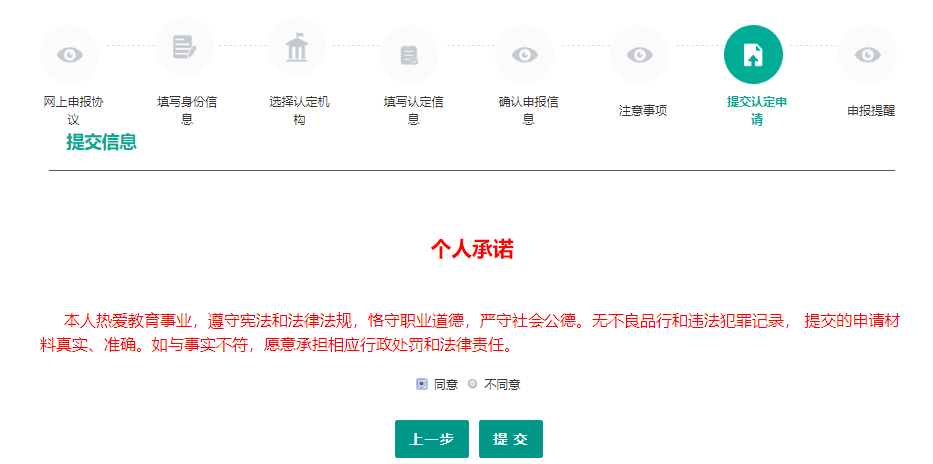 請(qǐng)仔細(xì)閱讀個(gè)人承諾,并在頁面下方勾選是否同意,如選擇不同意,點(diǎn)擊【提交】按鈕后,視為放棄本次報(bào)名并返回業(yè)務(wù)平臺(tái);選擇同意,點(diǎn)擊【提交】按鈕進(jìn)入步驟八。