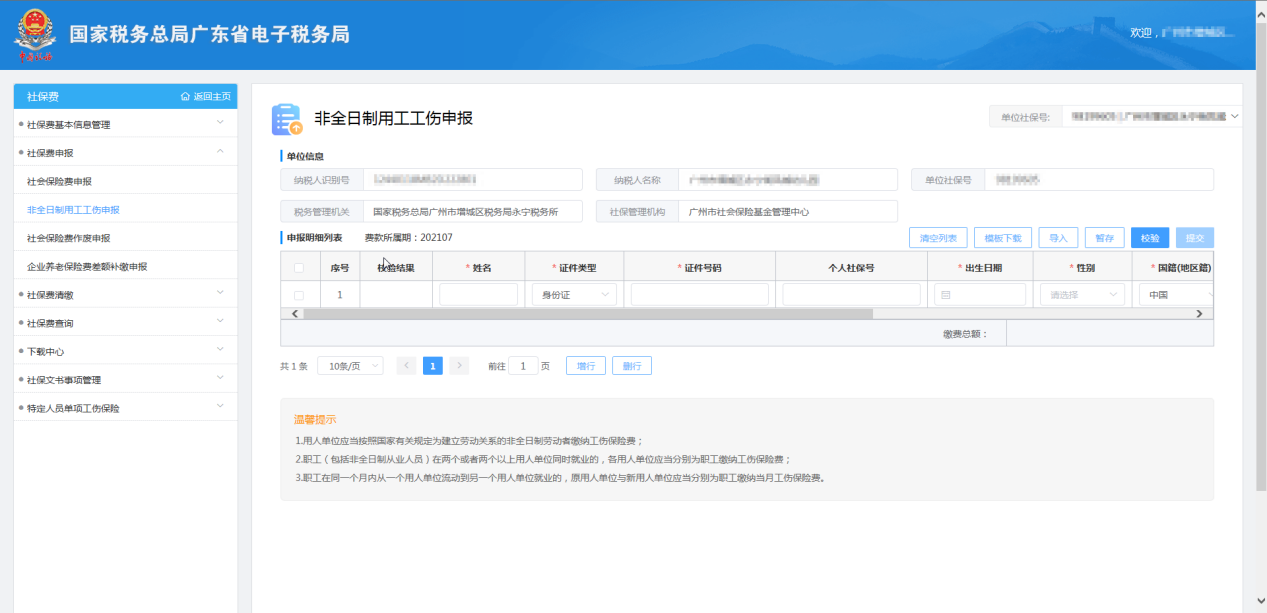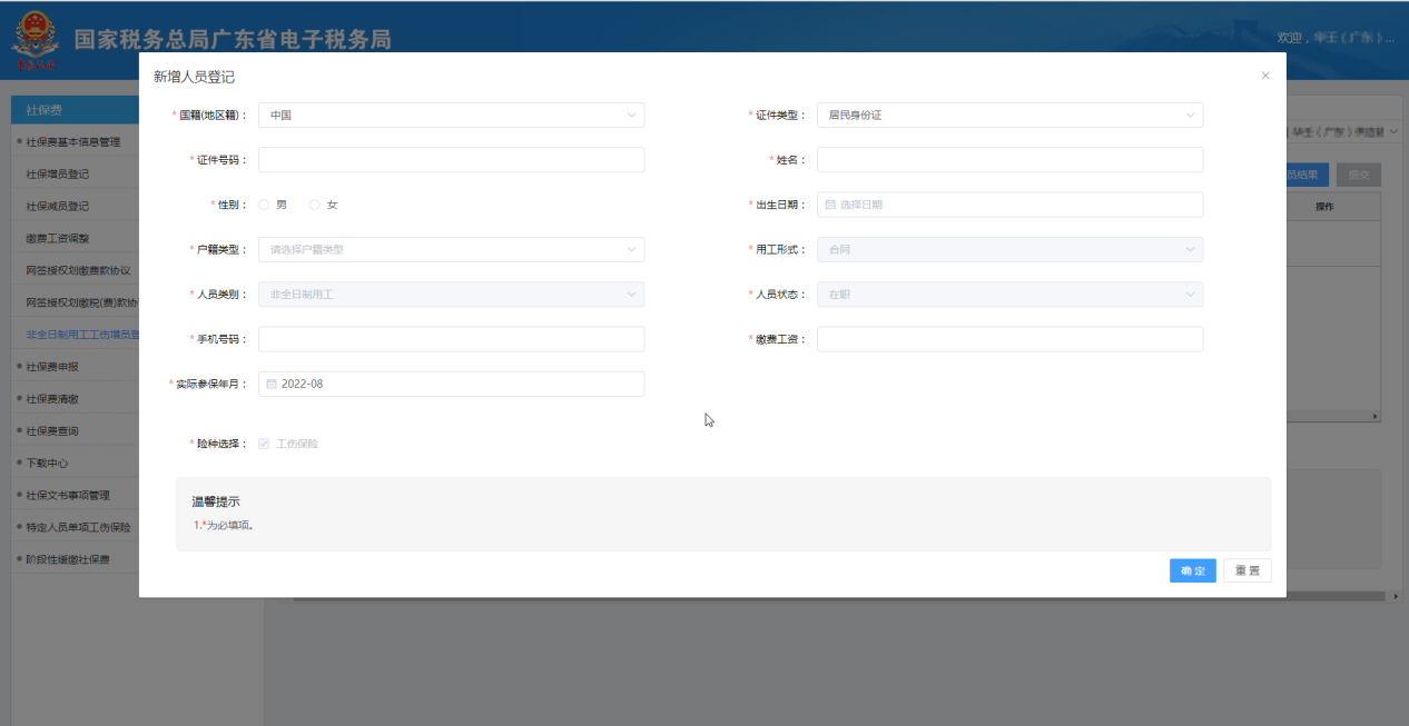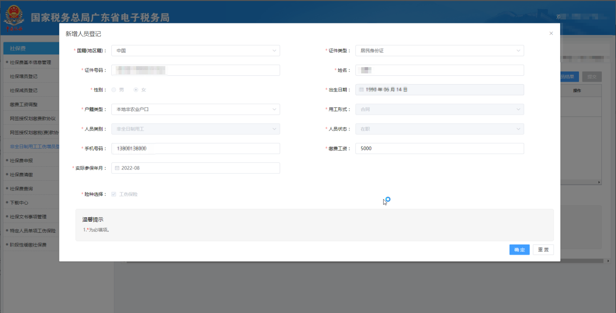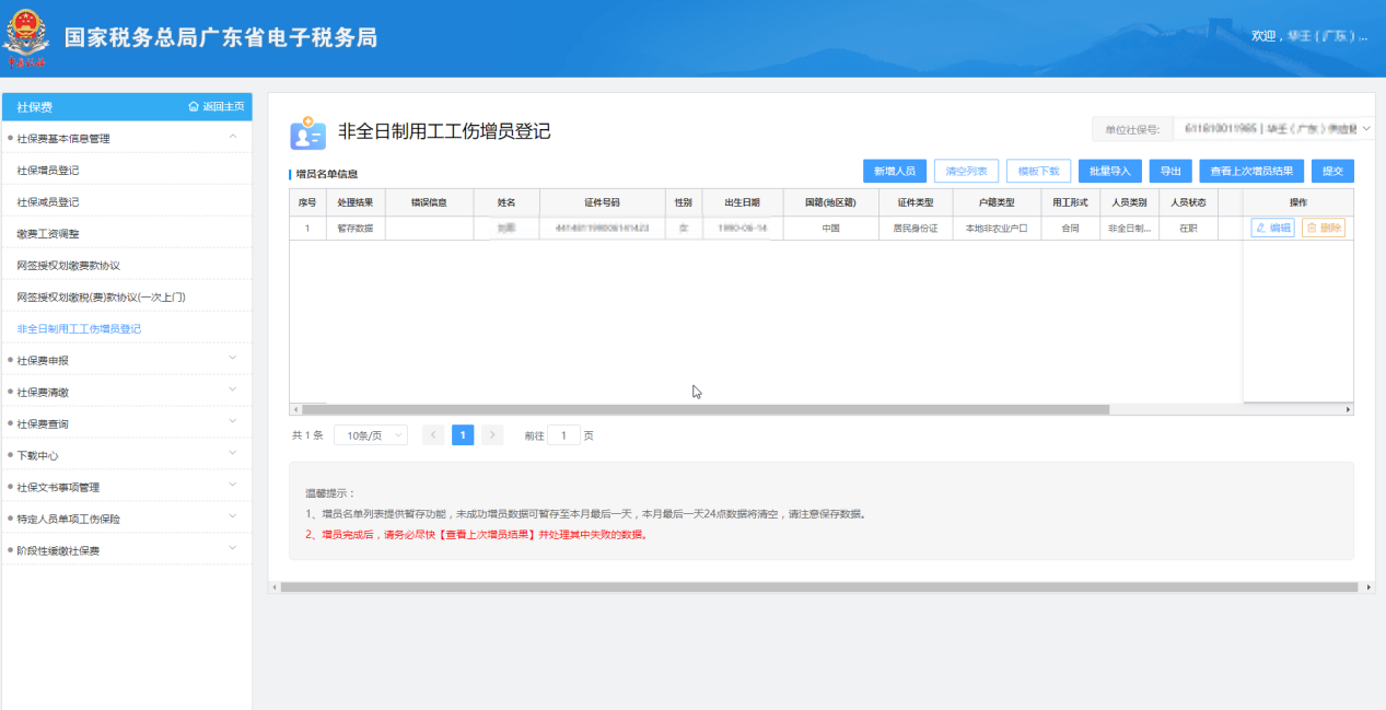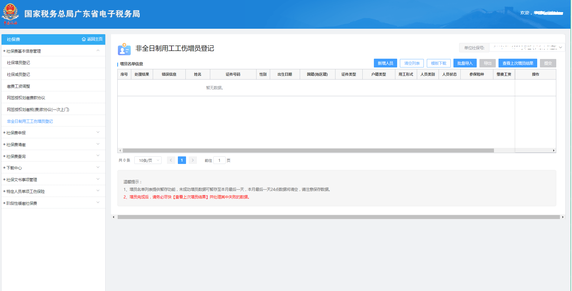 適用于用人單位為職工辦理非全日制用工工傷增員(參保)手續(xù),操作人員可以采用在線新增人員或者文件批量導(dǎo)入增員的形式,錄入人員的基礎(chǔ)信息、戶籍類型、繳費(fèi)工資和參保年月等。