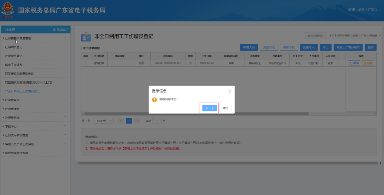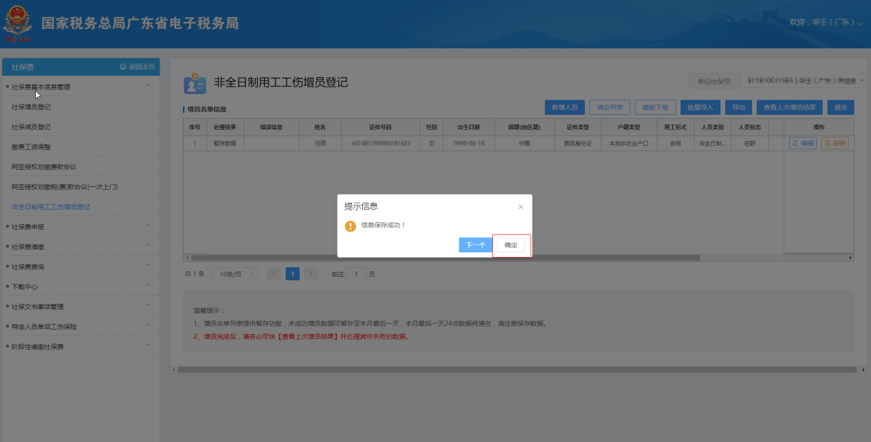 d) 點(diǎn)擊【確定】按鈕,提示信息頁面關(guān)閉,新增的人員信息暫時(shí)保存在【增員名單信息】列表;