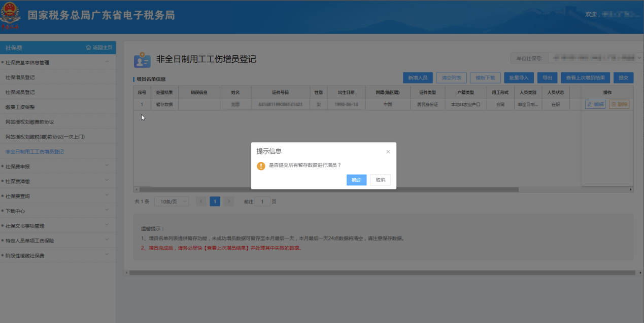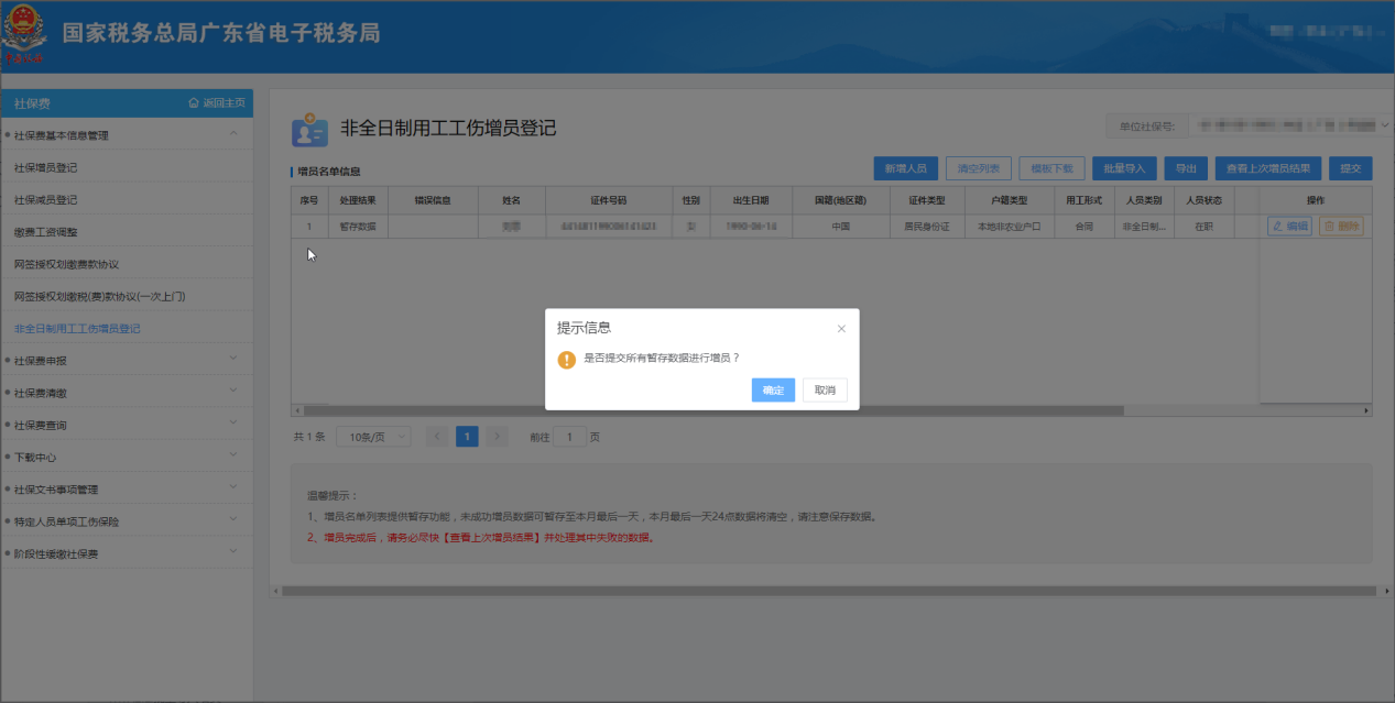 【提交】:可提交【增員名單信息】列表中的暫存人員信息;
