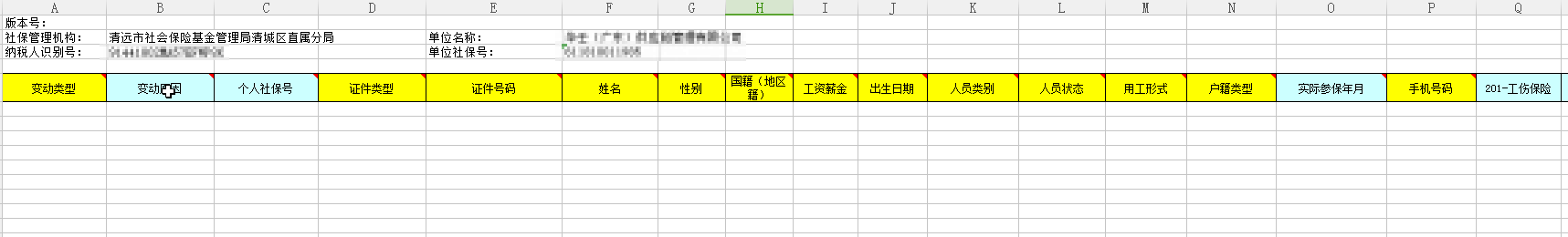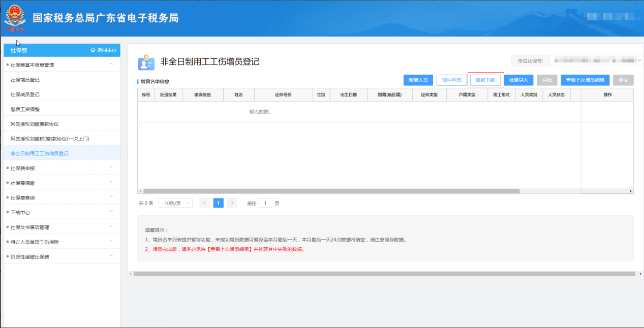 a) 點(diǎn)擊菜單【社保增員登記】模塊功能,進(jìn)入社保增員登記界面;點(diǎn)擊【模板下載】按鈕下載空模板,錄入新增人員信息;
