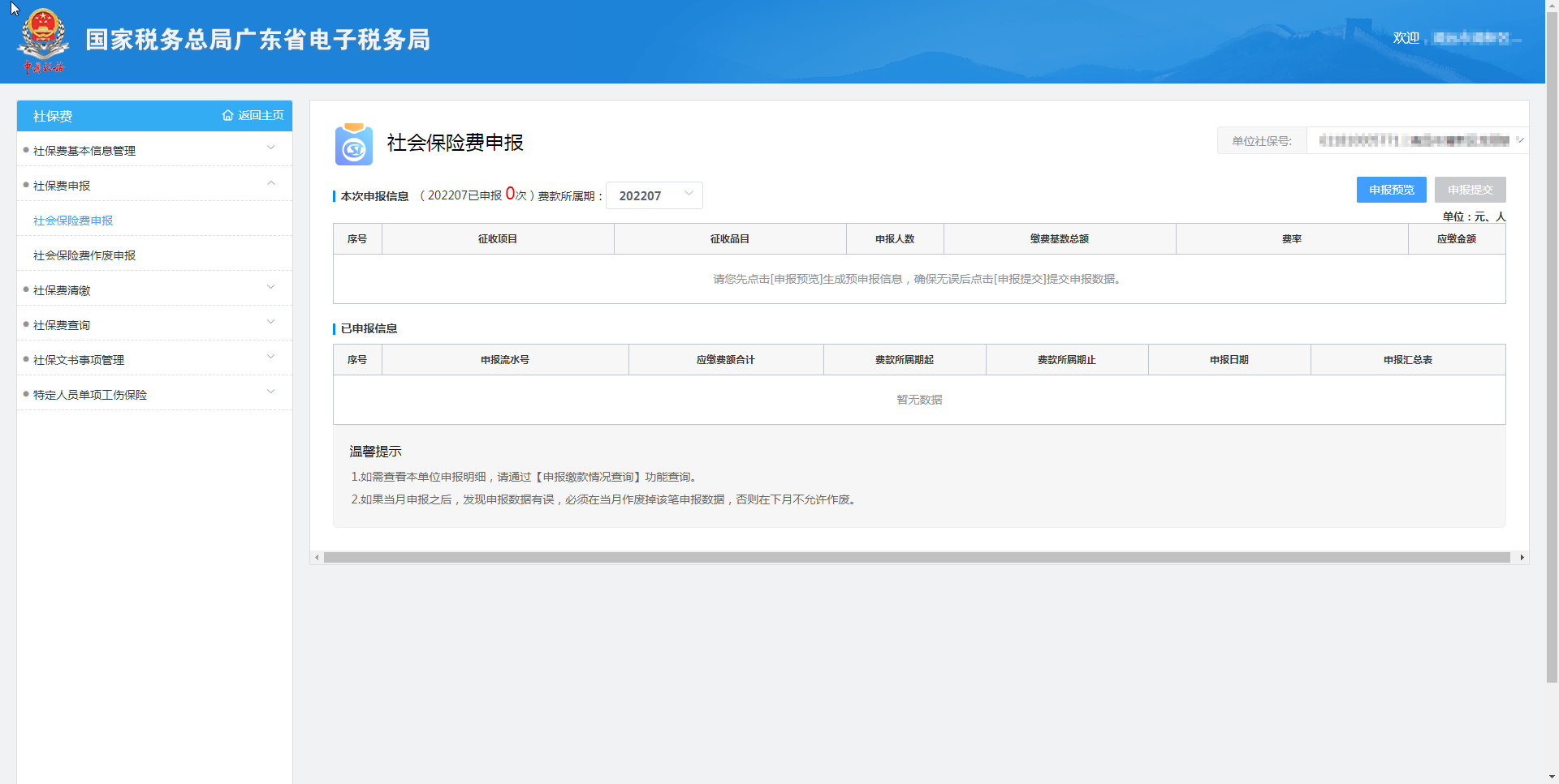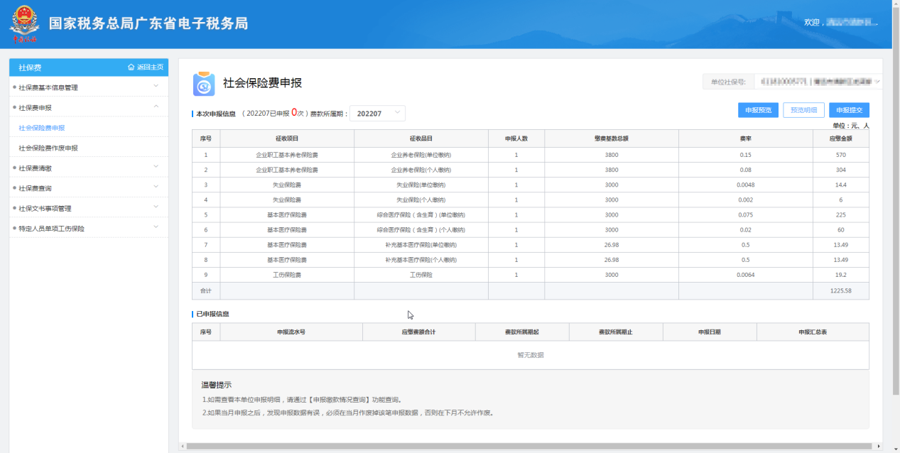 【本次申報信息】:預覽展示當前社會保險費申報的匯總信息;