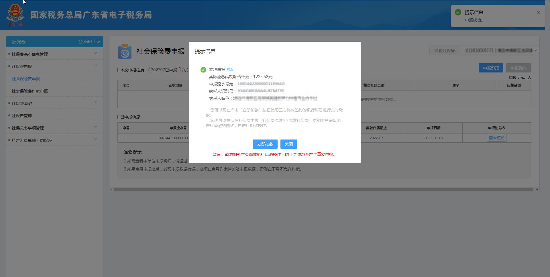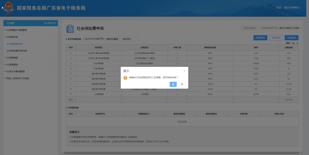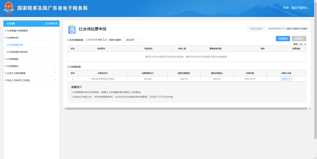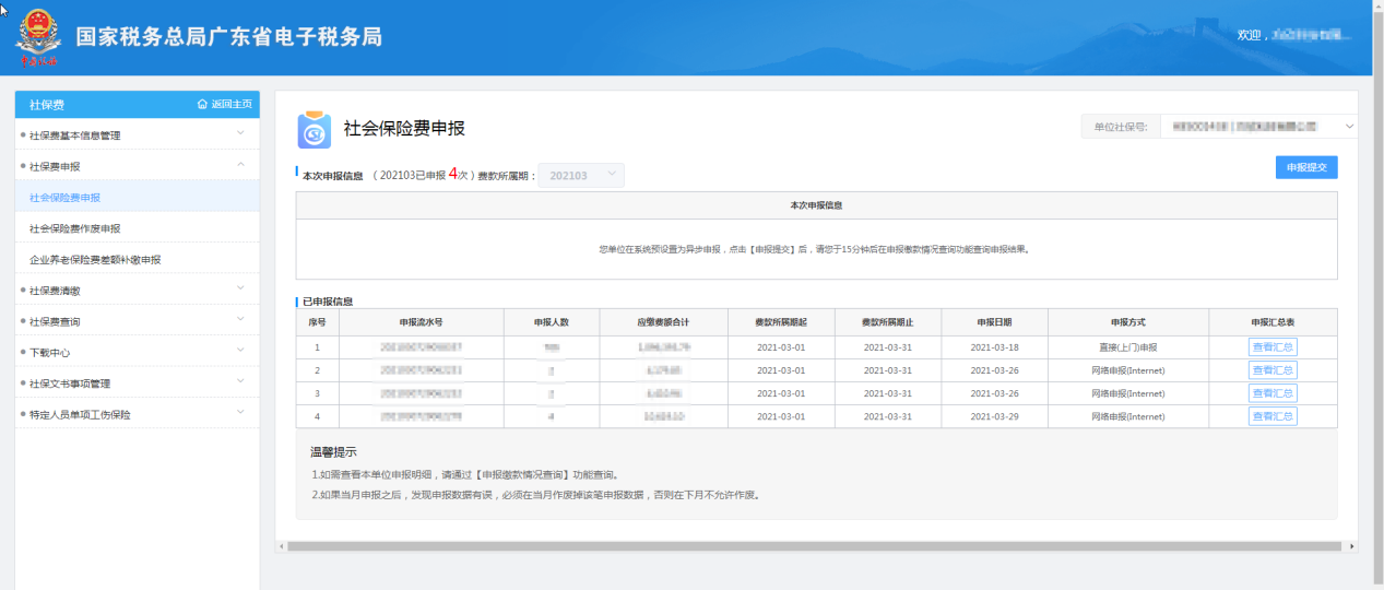 【申報提交】:提交申報社會保險費;