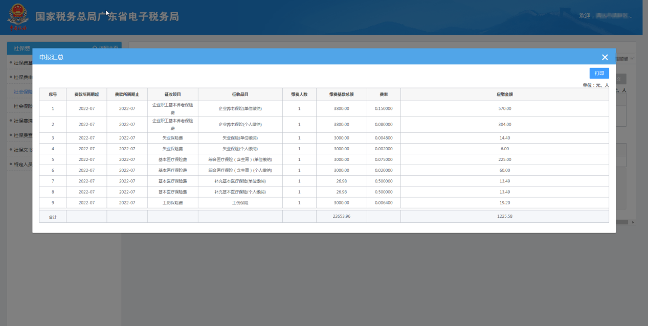 【查看匯總】:查看已經(jīng)申報的社會保險費匯總信息。