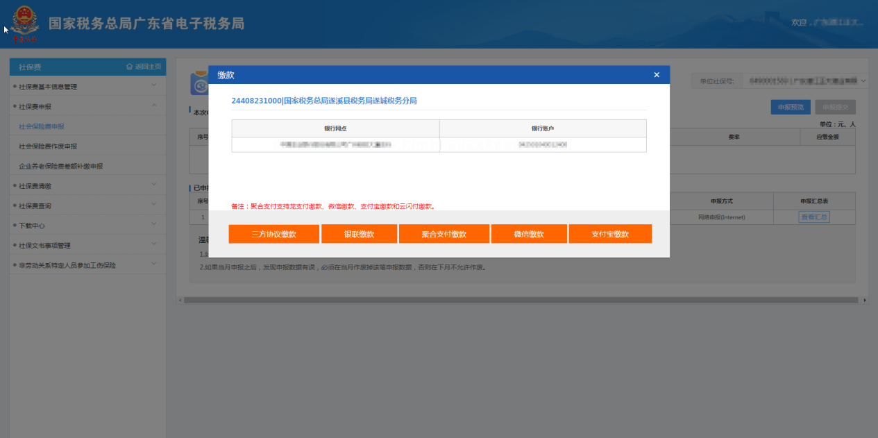 【關閉】:單位申報完成社會保險費后,暫時無需清繳,可關閉當前窗口。