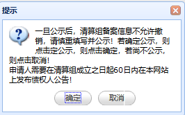 2提交債權(quán)人公告:確認(rèn)好錄入的債權(quán)人信息,點(diǎn)擊【公示】按鈕,在彈出的提示框點(diǎn)擊【確定】完成清算組備案公示。