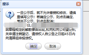 3.提交清算組備案信息:確認(rèn)好錄入的清算組基本信息及清算組成員信息,點(diǎn)擊【公示】按鈕,在彈出的提示框點(diǎn)擊【確定】完成清算組備案公示。