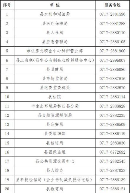 為推動(dòng)秭歸縣各部門進(jìn)一步踐行“有呼必應(yīng)、無事不擾”的“店小二”精神,暢通企業(yè)群眾訴求表達(dá)渠道,提升企業(yè)群眾滿意度和獲得感,現(xiàn)將秭歸縣“店小二”服務(wù)專線電話予以公布,企業(yè)和群眾可撥打秭歸縣“店小二”總服務(wù)專線電話12345進(jìn)行政策咨詢或提出意見建議,也可撥打各部門服務(wù)專線電話。