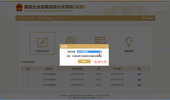 第二步:選擇填報年度。如往年未填報,須先補報,再報送2016年度的年報。