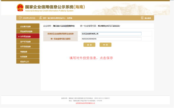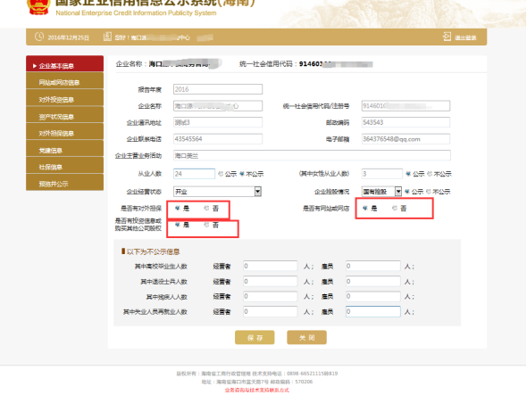 第四步:進入填報頁面。企業(yè)根據(jù)實際情況選擇“是否有網(wǎng)站或網(wǎng)店”、“企業(yè)是否有投資信息或購買其他公司股權(quán)”,如選擇“是”,則必須填寫“網(wǎng)站或網(wǎng)店信息”、“對外投資信息”。