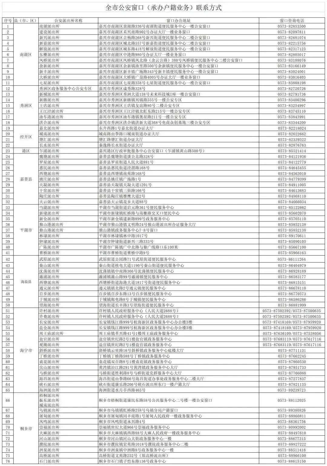 嘉興市全市公安窗口(承辦戶籍業(yè)務(wù))聯(lián)系方式