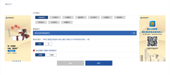 5、申請(qǐng)人需填寫委托代理人身份信息及身份證明材料,點(diǎn)擊【提交】按鈕后,您的開戶申請(qǐng)成功。系統(tǒng)將自動(dòng)將信息推送給相關(guān)銀行,稍后會(huì)有銀行業(yè)務(wù)人員主動(dòng)與您聯(lián)系。