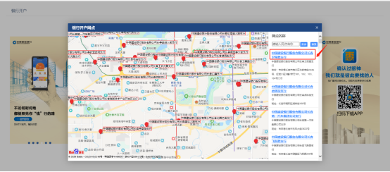 3、確定開戶銀行之后,需要選擇營(yíng)業(yè)網(wǎng)點(diǎn)。點(diǎn)擊后系統(tǒng)會(huì)彈出所有受理網(wǎng)上開戶申請(qǐng)的銀行網(wǎng)點(diǎn),申請(qǐng)人可以在地圖上選擇就近網(wǎng)點(diǎn)。如下圖: