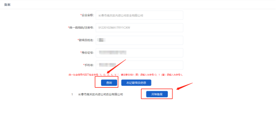 3. 進(jìn)入備案登記頁面,填寫信息,點(diǎn)擊查詢,顯示企業(yè)信息,點(diǎn)擊【開始備案】