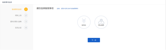 5. 進(jìn)入備案事項(xiàng)選擇頁面,選擇需要備案的事項(xiàng),點(diǎn)擊【下一步】。