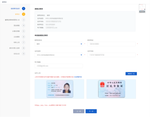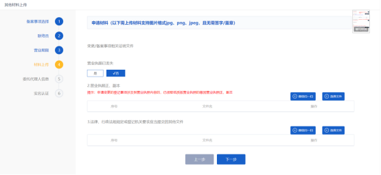 8. 材料上傳,這里會(huì)根據(jù)前面選擇的變更項(xiàng),進(jìn)行顯示材料上傳信息,進(jìn)行對應(yīng)的材料信息上傳,點(diǎn)擊【下一步】