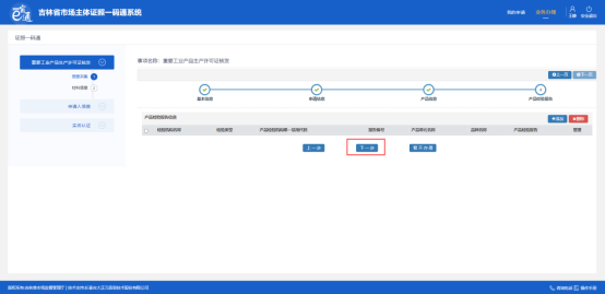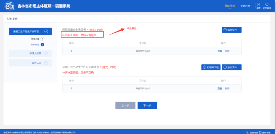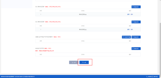 材料上傳完畢后,點(diǎn)擊頁面底部“下一步”按鈕,保存材料信息,如下圖:
