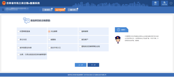 5、 選擇注銷原因后,點(diǎn)擊“下一步”,跳轉(zhuǎn)到選擇辦理注銷的事項(xiàng)頁(yè)面,如圖: