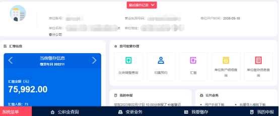 上方信息欄顯示個人的相關(guān)信息,下方有【公積金查詢】、【變更業(yè)務】、【我要繳存】、【我的申報】四個模塊