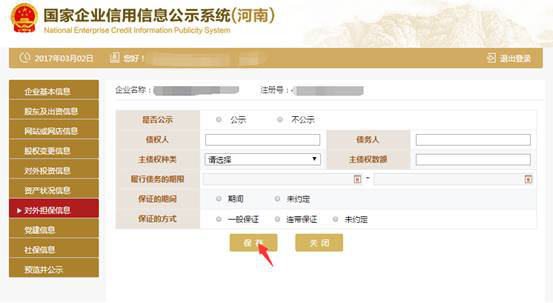 第十五步:填寫對外擔保信息。點擊左邊的對外擔保信息,根據(jù)實際情況進行添加之后點擊“保存”。