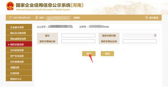第十二步:填寫股權變更信息,點擊左邊的“股權變更信息”,之后再點擊“保存”