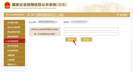 第十三步:填寫對外投資信息。點擊左邊的“對外投資信息”,之后再根據(jù)實際情況填寫完點擊“保存”。