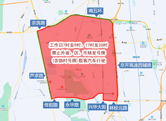 大興區(qū)限行范圍:京開高速公路西輔路(含)、南五環(huán)路(不含)、京良路南五環(huán)至蘆求路之間路段(含)、蘆求路(不含)、佟前路(含)、永華路(含)、興華大街(含)、林校北路(含)圍成區(qū)域以內(nèi)道路。