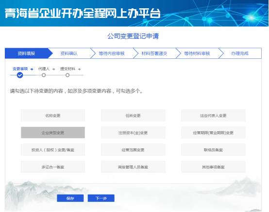 根據(jù)變更需求勾選變更事項(xiàng),點(diǎn)擊保存進(jìn)入下一步。