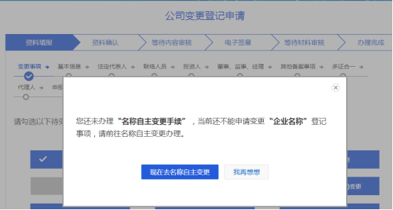 若勾選名稱變更,點(diǎn)擊下一步系統(tǒng)跳轉(zhuǎn)至名稱自主變更申報(bào)界面,變更后名稱核準(zhǔn)通過(guò)后再次通過(guò)該界面點(diǎn)擊下一步繼續(xù)名稱變更操作。