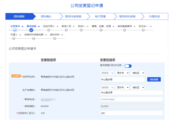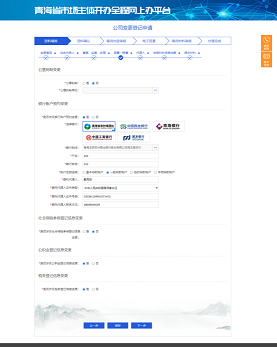 其余變更事項(xiàng)勾選后點(diǎn)擊下一步,直接進(jìn)入基本信息界面,錄入變更后信息進(jìn)行業(yè)務(wù)申報(bào)的提交。提交后與設(shè)立流程一致,等待市場(chǎng)監(jiān)管部門審核,審核通過(guò)后進(jìn)行電子簽名操作,具體操作流程請(qǐng)查看模塊四,電子簽名。