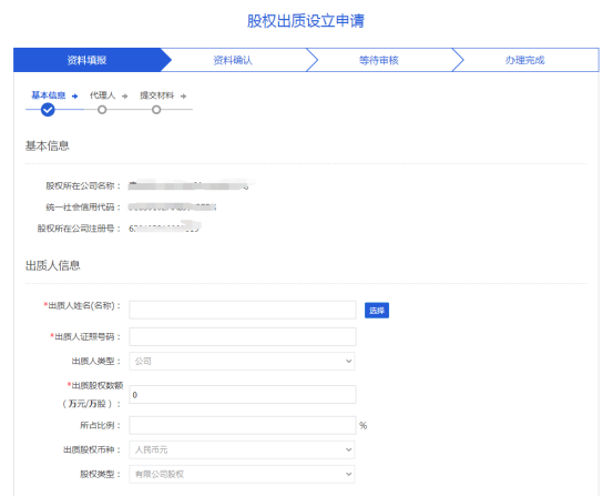 錄入股權(quán)出質(zhì)登記基本信息,完善代理人信息后,點(diǎn)擊下一步,進(jìn)行業(yè)務(wù)申報(bào)的提交,后續(xù)等待市場(chǎng)監(jiān)管部門審核即可。