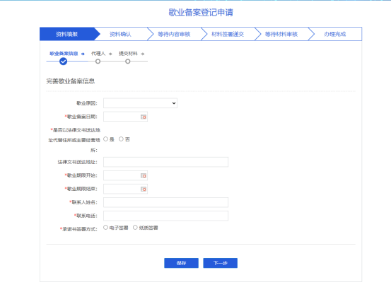 錄入歇業(yè)備案登記基本信息,選擇承諾書簽署方式進(jìn)行承諾書簽署,選擇完善代理人信息后,點(diǎn)擊下一步,進(jìn)行業(yè)務(wù)申報(bào)的提交,后續(xù)等待市場(chǎng)監(jiān)管部門審核即可。