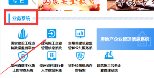 1.打開“貴州省住房和城鄉(xiāng)建設(shè)廳”官網(wǎng)的業(yè)務(wù)系統(tǒng),企業(yè)類型自行選擇登錄對應(yīng)業(yè)務(wù)管理系統(tǒng)。如圖示: