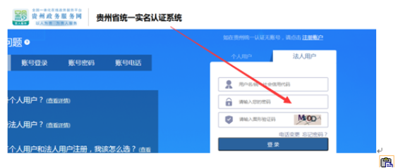2.頁面跳轉(zhuǎn)到“貴州政務(wù)服務(wù)網(wǎng)”在登錄頁面輸入企業(yè)的用戶名和密碼。如圖示: