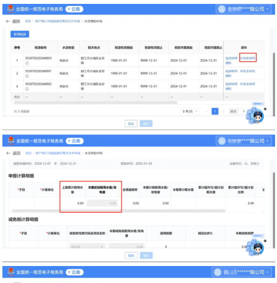 采集完成后,可點(diǎn)擊【申報(bào)表明細(xì)】進(jìn)入申報(bào)頁(yè)面,該頁(yè)面主要涉及填寫(xiě)信息為“本期實(shí)際取水量/發(fā)電量”相關(guān)數(shù)據(jù),需根據(jù)實(shí)際取水量/發(fā)電量情況進(jìn)行數(shù)據(jù)錄入。2025年1月做首次申報(bào)時(shí),即申報(bào)2024年12月或2024年四季度稅款時(shí),需自行填寫(xiě)“上期累計(jì)取水量”數(shù)據(jù);申報(bào)2025年及以后所屬期稅款時(shí),該數(shù)據(jù)無(wú)需且不允許自行填寫(xiě)。若存在符合條件的減免稅情形,可在申報(bào)頁(yè)面【減(免)稅計(jì)算明細(xì)】表中選擇適用的減免性質(zhì)及代碼,錄入對(duì)應(yīng)用水量、發(fā)電量相關(guān)數(shù)據(jù),系統(tǒng)會(huì)自動(dòng)進(jìn)行減免計(jì)算。全部信息錄入完成,且核對(duì)無(wú)誤后即可點(diǎn)擊【提交】。