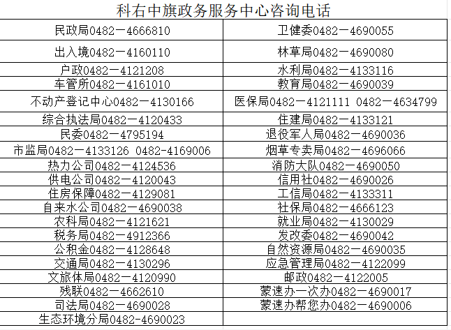 | 科右中旗政務(wù)服務(wù)中心咨詢(xún)電話 | |