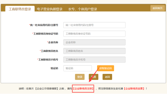 在工商聯(lián)絡(luò)員登錄頁(yè)面最下面點(diǎn)【企業(yè)聯(lián)絡(luò)員注冊(cè)】進(jìn)行注冊(cè),如下圖: