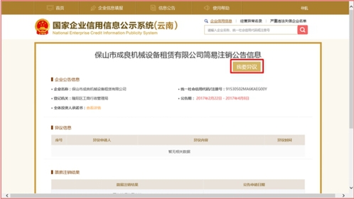第四步:點(diǎn)擊“我要異議”按鈕,之后進(jìn)入企業(yè)簡(jiǎn)易注銷(xiāo)公告頁(yè)面,再次點(diǎn)擊“我要異議”按鈕。