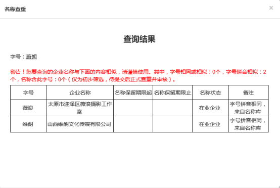 填寫完成后,點擊[查重],驗證是否可以使用該名稱。查詢結(jié)果如圖7: