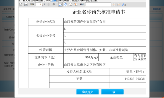 確認信息無誤后,點擊【確認提交】,也可點擊【下載】,系統(tǒng)會進入辦理流程界面,顯示用戶當前辦理業(yè)務的流程。如圖12:等待工商審核結(jié)果。
